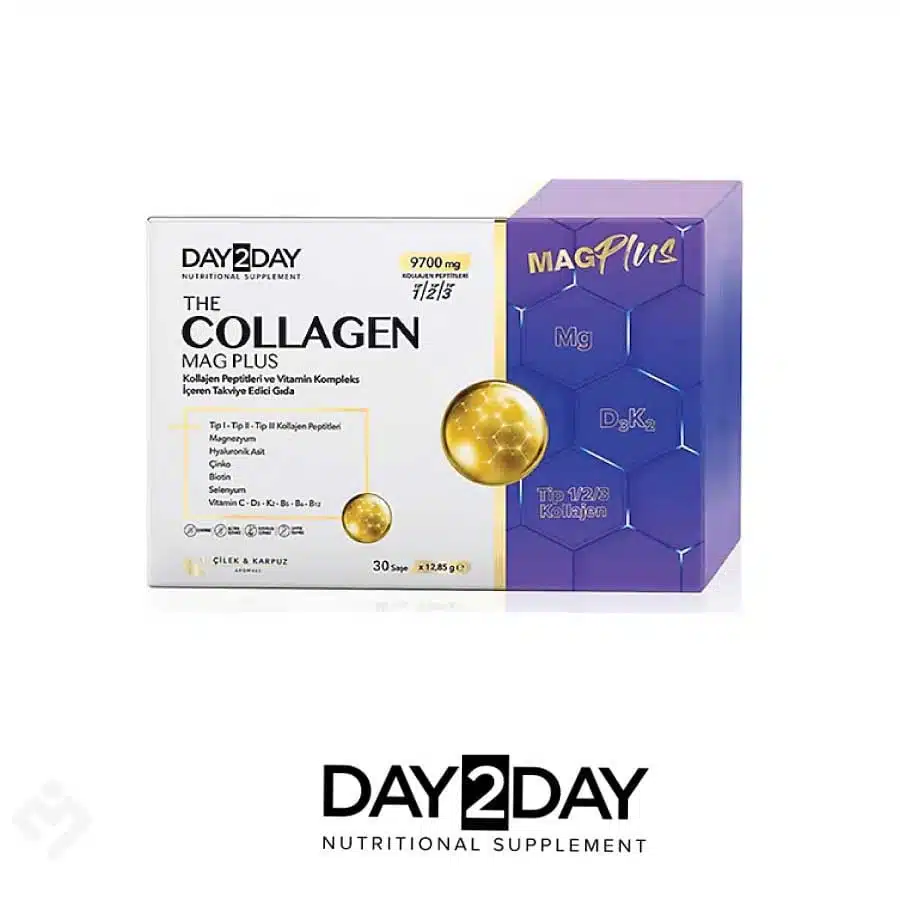 Day2Day The Collagen Mag Plus takviye edici gıda, cilt sağlığını desteklemek ve yaşlanma belirtilerini azaltmak için geliştirilmiş özel bir formüle sahiptir. 30 şase halinde sunulan bu ürün, kolajen ve magnezyumun birleşimiyle cildin elastikiyetini artırmaya, hücre yenilenmesini desteklemeye yardımcı olur. Aynı zamanda saç, tırnak ve eklem sağlığını güçlendiren bütünsel bir güzellik desteği sağlar.