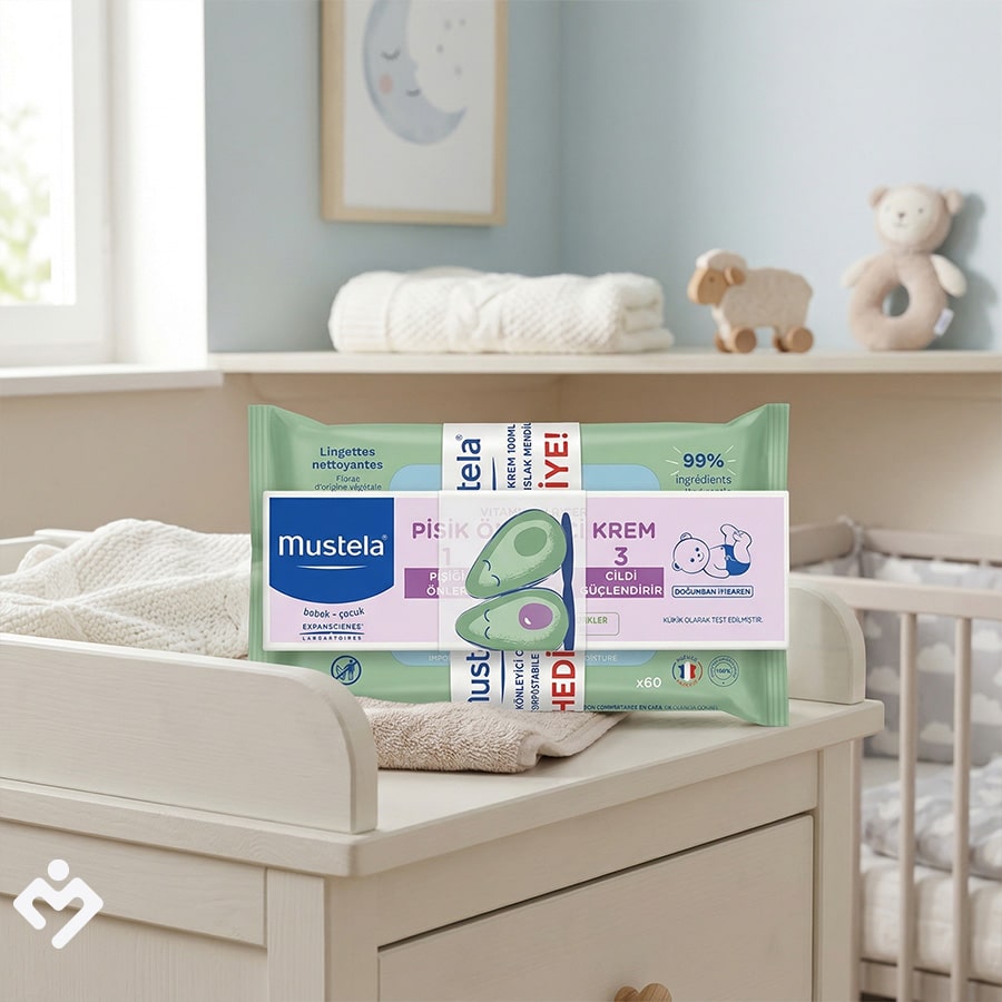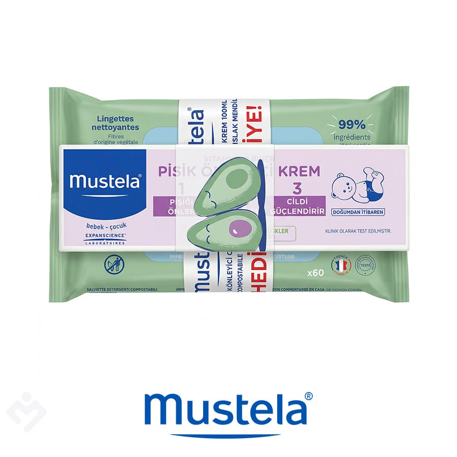 Mustela Vitamin Bariyer Pişik Önleyici Krem ve Ekolojik Islak Mendil seti, bebeğinizin en hassas bölgesi olan bez bölgesi bakımı için eksiksiz bir temizlik ve koruma rutinini bir araya getirir. Mustela 123 Vitamin Bariyer Krem; pişiği önleme, yatıştırma ve onarma olmak üzere üç aşamalı etkisiyle bilinir. Yanında hediye olarak sunulan Ekolojik Islak Mendil ise plastik içermeyen, bitkisel kökenli lifleriyle bebeğinizin cildini nazikçe temizlerken doğayı da korur.